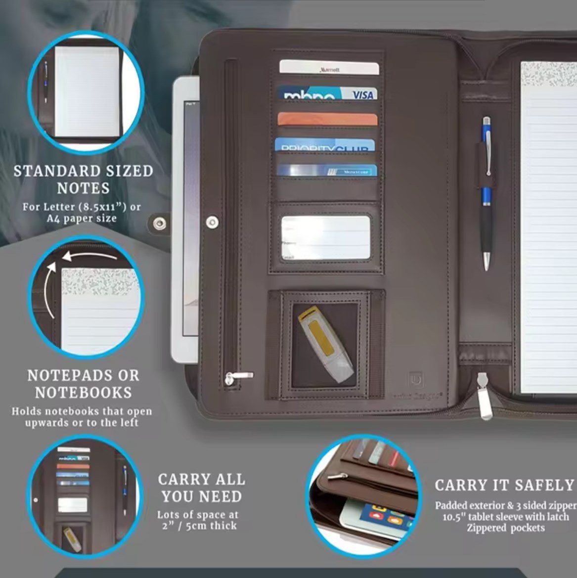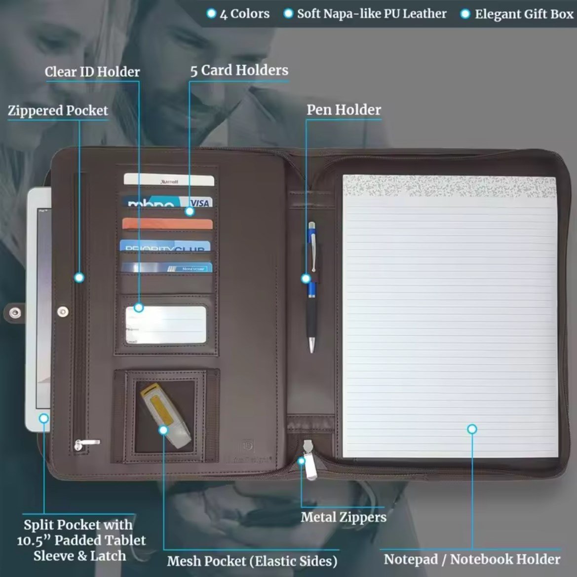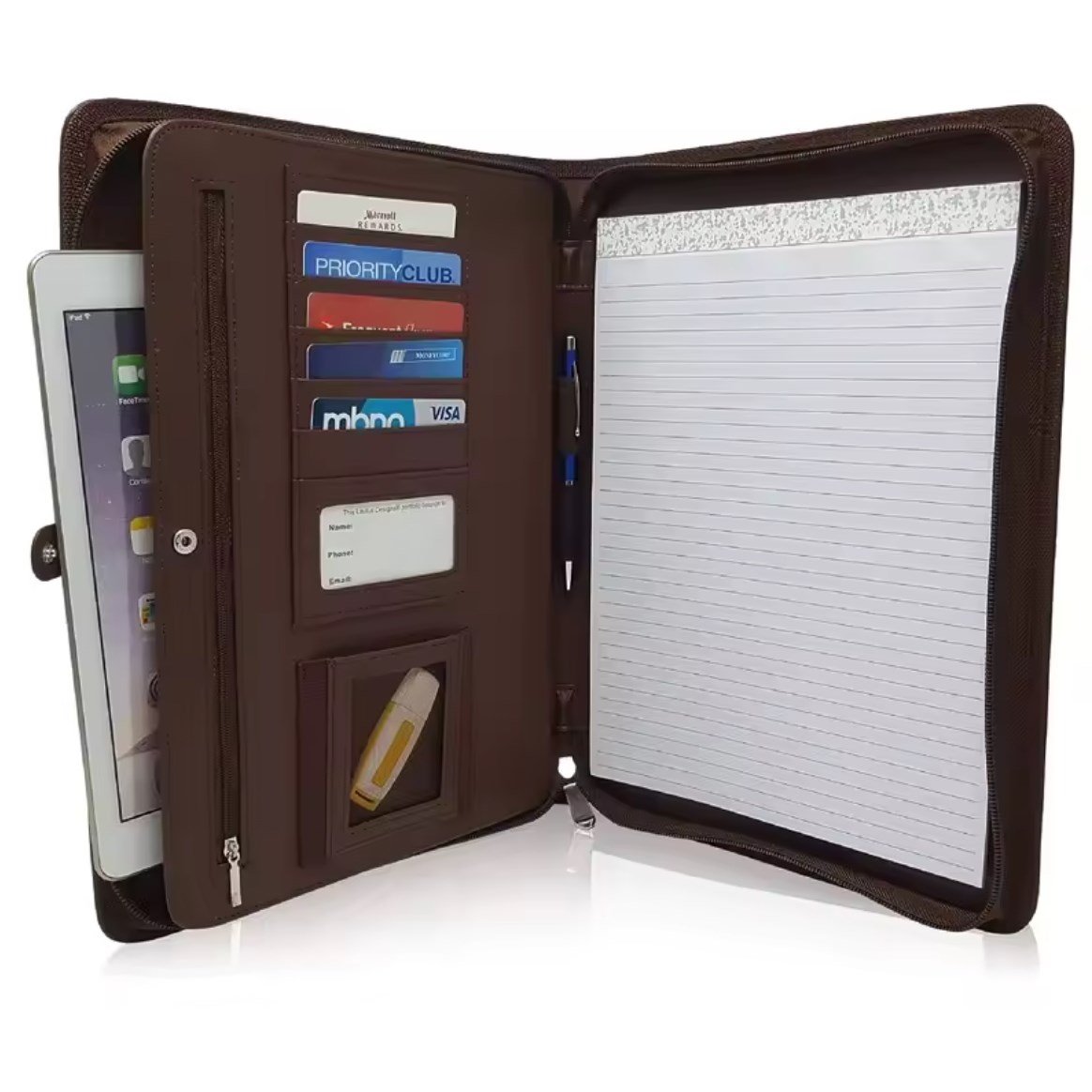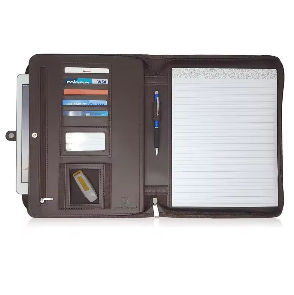 Custom Luxury Brown Padfolio Planner File Folder Business Document Brown PU Leather Portfolio with Zipper